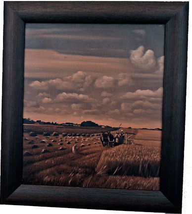 Tidlig ute: Det ble rekordtidlig tresking for Steinar Solum på jordene langs Hortensveien i år. Bildet er tatt under årets tresking. Det var viss takst at det skulle trøskes ut av halmen alt kornet før jul. Nils, rådsdrengen, sto for treskinga, Jens og guttene, Ola og Kristian, hjalp til etter hvert som .